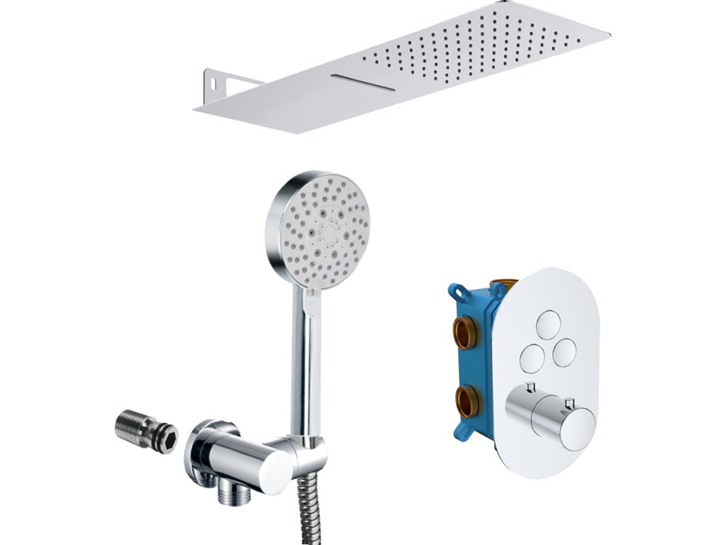 Součástí setu je talířová sprcha s vodopádem 500x200 mm, držák sprchy, pětipolohová sprcha, nerezová dvouzámková hadice 150 cm, stěnový vývod.