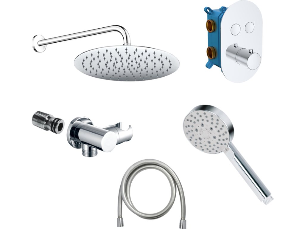 Součástí setu je pětipolohová sprcha, plastová šedostříbrná hadice 120 cm, stěnový vývod s držákem, kulaté rameno ze zdi 330 mm, nerezová talířová sprcha Slim ø 200 mm.