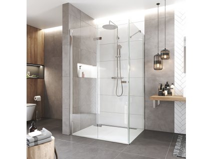 Hliníkové profily v barvě chrom, pivotové jednokřídlé dveře a pevný díl, sklo Point, síla skla 6 mm, obdélník, 1000 (dveře) x 900 (pevný díl), výška 1900 mm.
