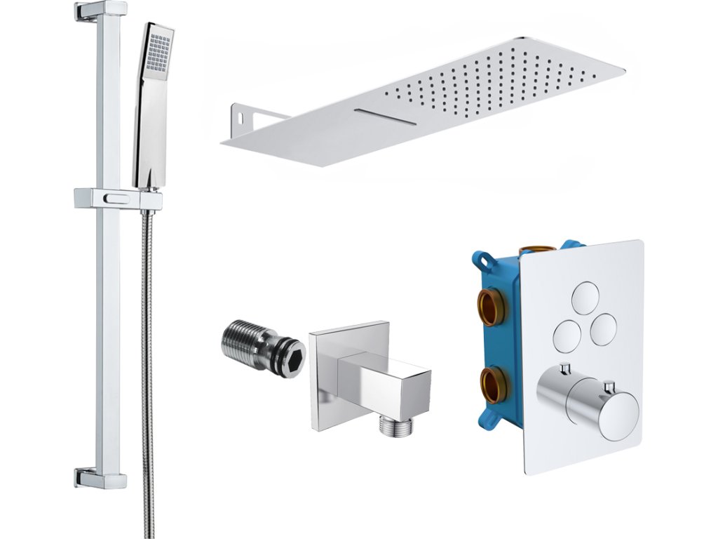 Součástí setu je talířová sprcha s vodopádem 500x200 mm, posuvný držák, jednopolohová sprcha, dvouzámková nerez hadice 150 cm, stěnový vývod.