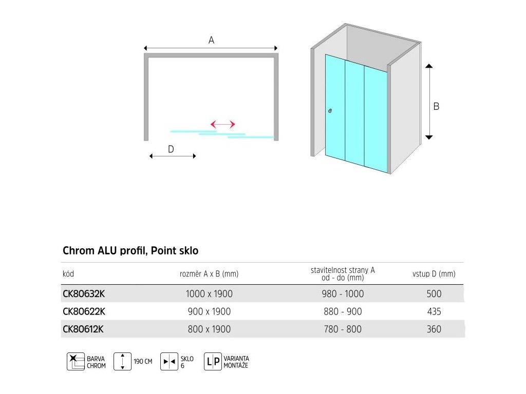Mereo Sprchové dveře, Lima, trojdílné, zasunovací, 80x190 cm, chrom ALU, sklo Point CK80612K