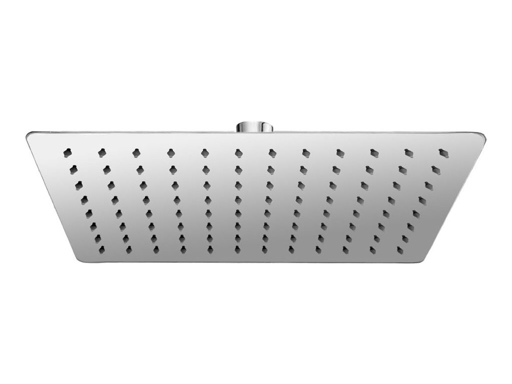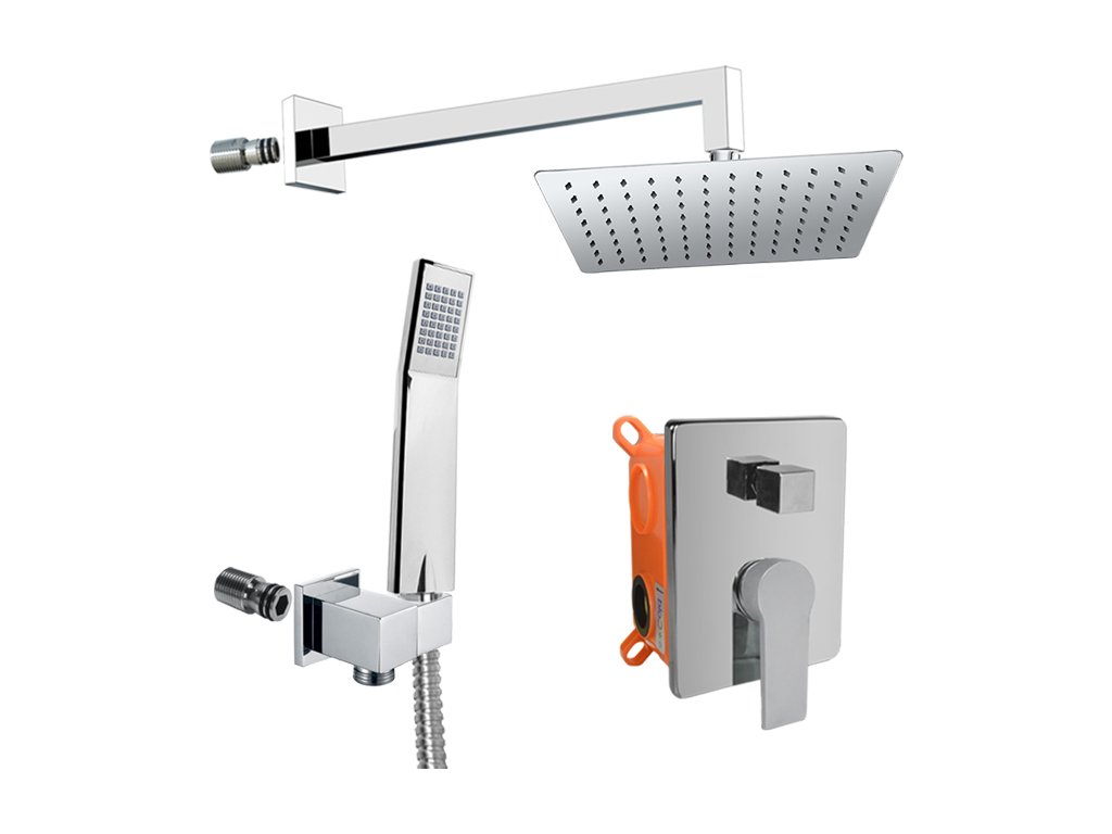 Dvoucestná podomítková baterie s keramickým přepínačem, Mbox, hranatý kryt, vývod s držákem sprchy, rameno ze zdi 330 mm, nerezová talířová sprcha slim 300x200 mm, nerezová dvouzámková hadice 150 cm, jednopolohová ruční sprcha.