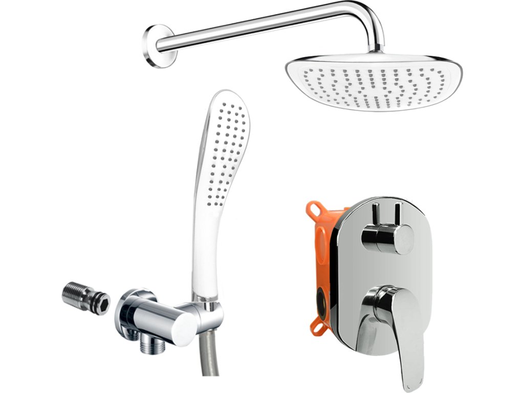 Soubory ke stažení:Dvoucestná podomítková baterie s keramickým přepínačem, Mbox, oválný kryt, vývod s držákem sprchy, rameno ze zdi 330 mm, talířová oválná sprcha 230x180 mm bílá/chrom, šedostříbrná hadice 150 cm, jednopolohová ruční sprcha.