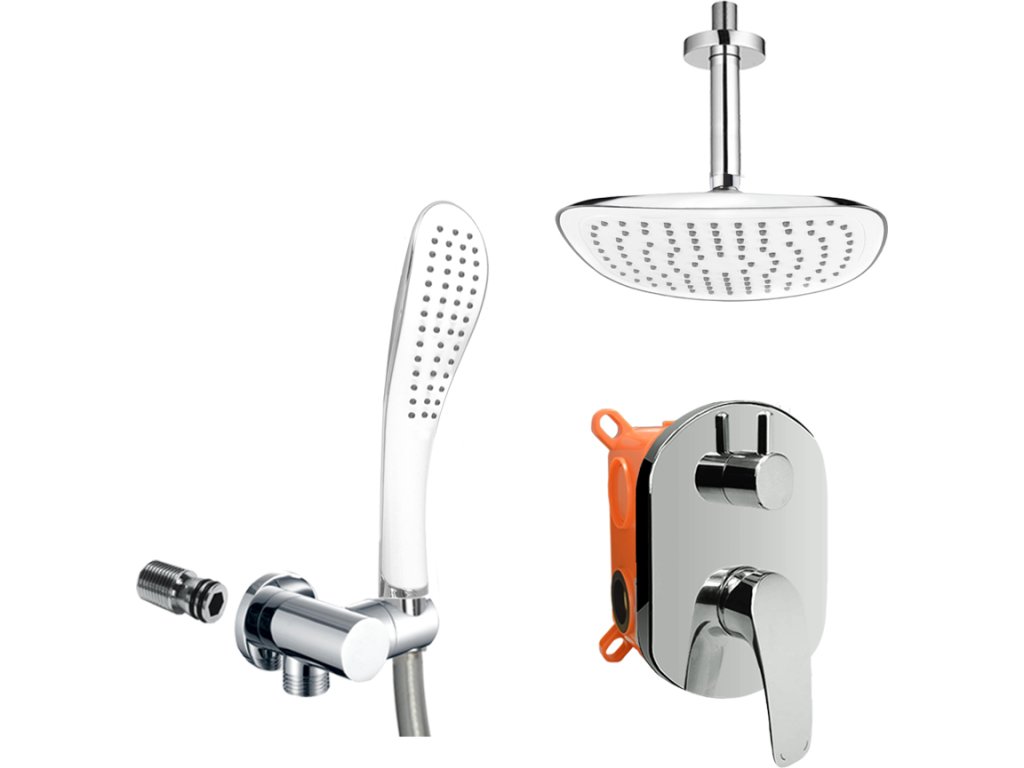 Soubory ke stažení:Dvoucestná podomítková baterie s keramickým přepínačem, Mbox, oválný kryt, vývod s držákem sprchy, stropní rameno, talířová oválná sprcha 230x180 mm bílá/chrom, šedostříbrná hadice 150 cm, jednopolohová ruční sprcha.