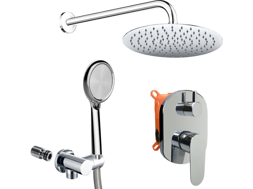 Dvoucestná podomítková baterie s keramickým přepínačem, Mbox, oválný kryt, vývod s držákem sprchy, rameno ze zdi 330 mm, nerezová talířová sprcha slim ø 300 mm, šedostříbrná hadice 150 cm, pětipolohová ruční sprcha.