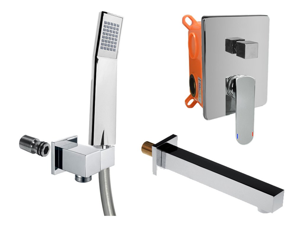 Dvoucestná podomítková baterie s keramickým přepínačem, Mbox, hranatý kryt, vývod s držákem sprchy, šedostříbrná hadice 150 cm, jednopolohová ruční sprcha, vanové napouštěcí ramínko.