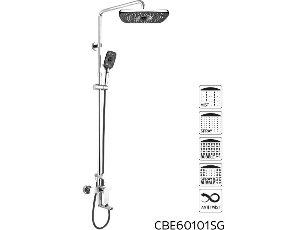 Vanový set obsahuje baterii se sprchovou soupravou a otočným ramínkem, třípolohovou ruční a hranatou talířovou sprchu. Sprcha je osazena standardním závitem 1/2" pro připojení na sprchovou hadici. Součástí je také černá připojovací hadice o délce 150 cm.
