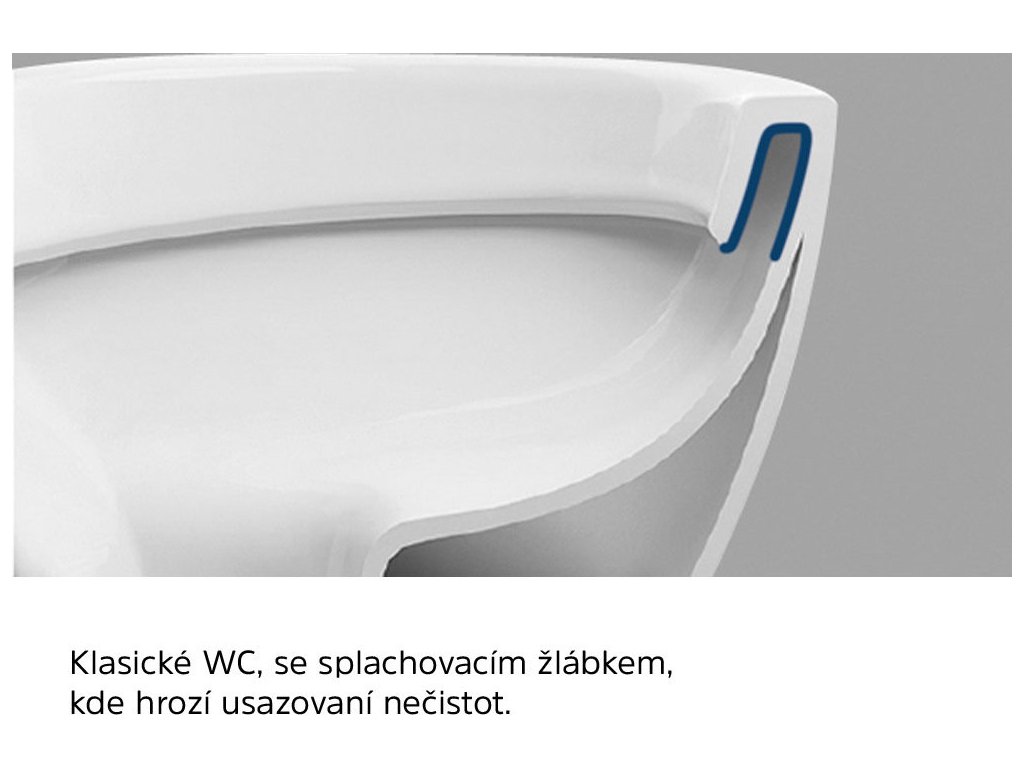 Díky novému tvaru mísy odpadá složité čištění splachovacího žlábku pod okrajem mísy, který je používaný na klasických klozetech, a kde by se mohly hromadit bakterie, špína a usazeniny.