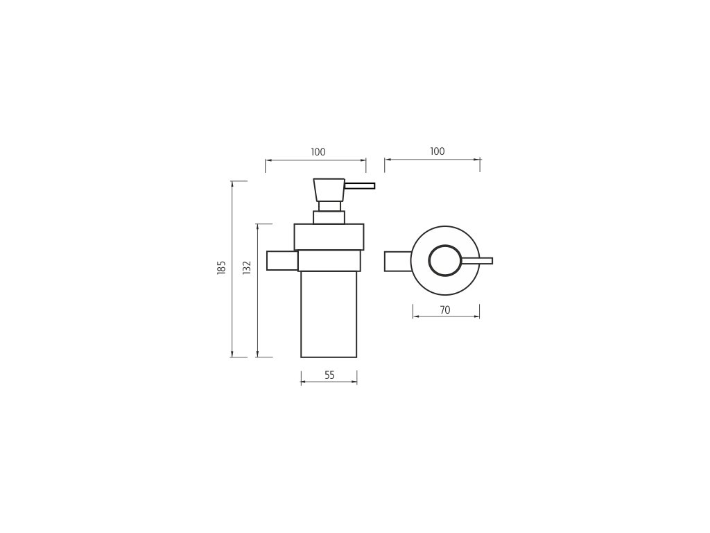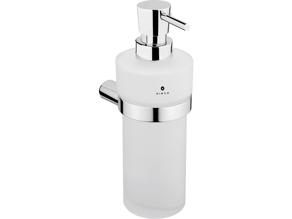 Nástěnný dávkovač tekutého mýdla. Pumpička mosazná s povrchovou úpravou chrom. Nádobka z matného skla, 250 ml.