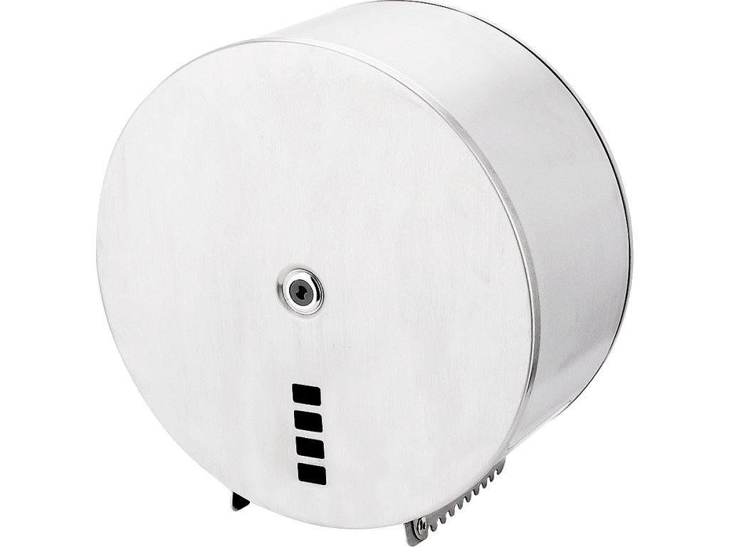 Zásobník toaletního papíru nerez velký kulatý je skvělým doplňkem k WC. Pro použití na toaletách ve společných prostorách jako jsou firmy, zdravotnická, kosmetická a jiná zařízení jsou vhodné vysoce hygienické toaletní papíry ve velkých rolích, pomocí kterých lze zachovat standardní hygienické podmínky i na velmi frekventovaných místech. Uzamykatelné zásobníky toaletního papíru jsou vyrobeny z vysoce kvalitní broušené nerez oceli 18/8. Uchycení pomocí 2-3 šroubů, dle potřeby. Rozteč mezi 2 hlavními otvory pro uchycení 168-177 mm. Součástí balení jsou 3 šrouby, 3 hmoždinky, 2x bezpečnostní klíč k otevírání zásobníku. Zásobník je určen pro papírové role max. šířky 24 cm s průměrem dutinky 6 cm. Zásobník toaletního papíru bude koupelně slušet mnohem více, pokud zvolíte i další doplňky série Hygienický program z nabídky koupelnových a WC doplňků NIMCO.