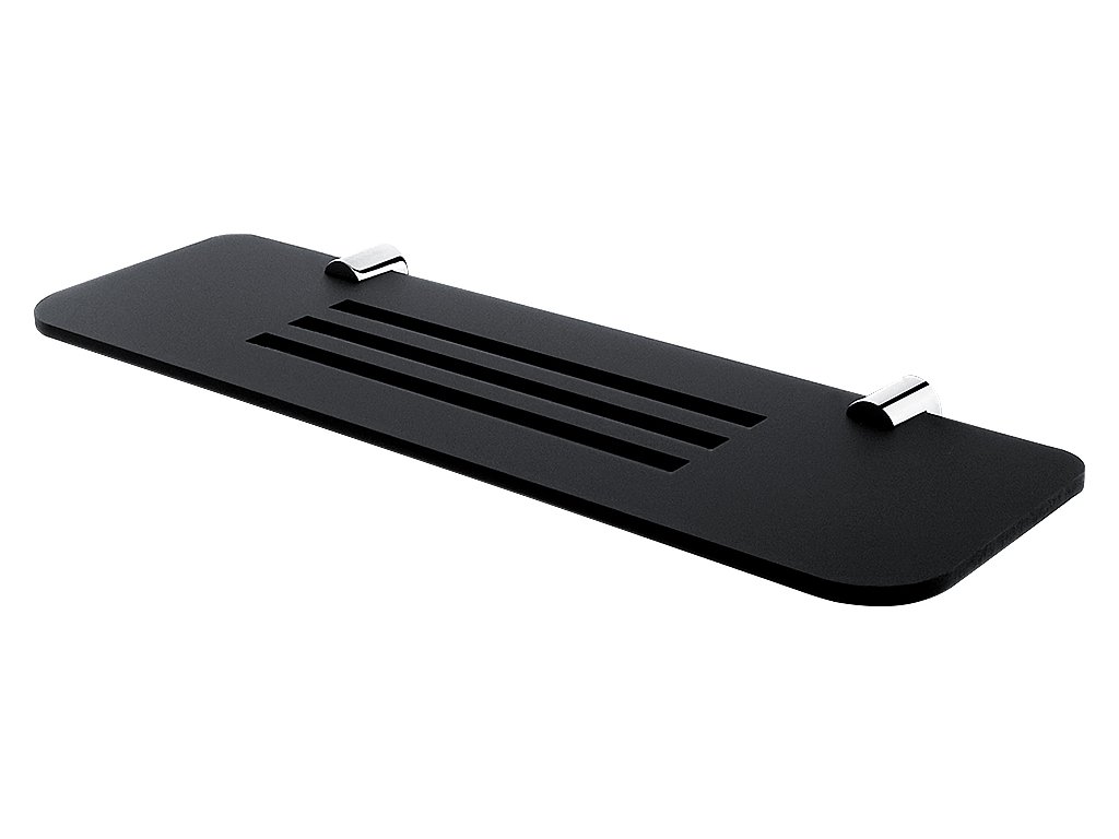Police s frézovanými otvory. Police plexiglass, matný povrch. Šířka police 40 cm.
