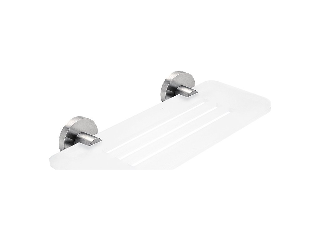 Police s frézovanými otvory. Materiál plexiglass s matným povrchem. Délka 30 cm. Úchyty broušená nerez.