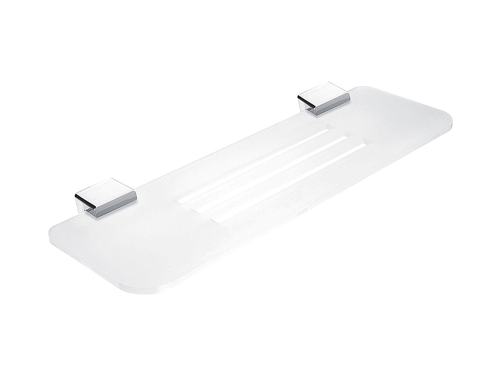 Police s frézovanými otvory. Materiál plexiglass s matným povrchem. Délka 40 cm. Úchyty mosaz / chrom.