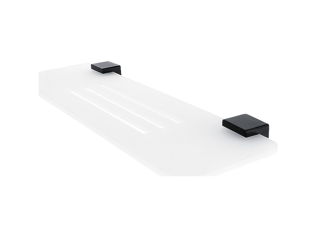 Police s frézovanými otvory. Materiál plexiglass s matným povrchem. Délka 40 cm. Úchyty mosaz / černý mat.