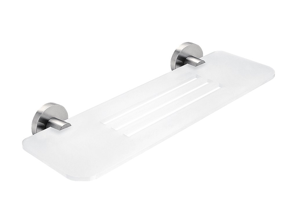 Police s frézovanými otvory. Materiál plexiglass s matným povrchem. Délka 40 cm. Úchyty broušená nerez.