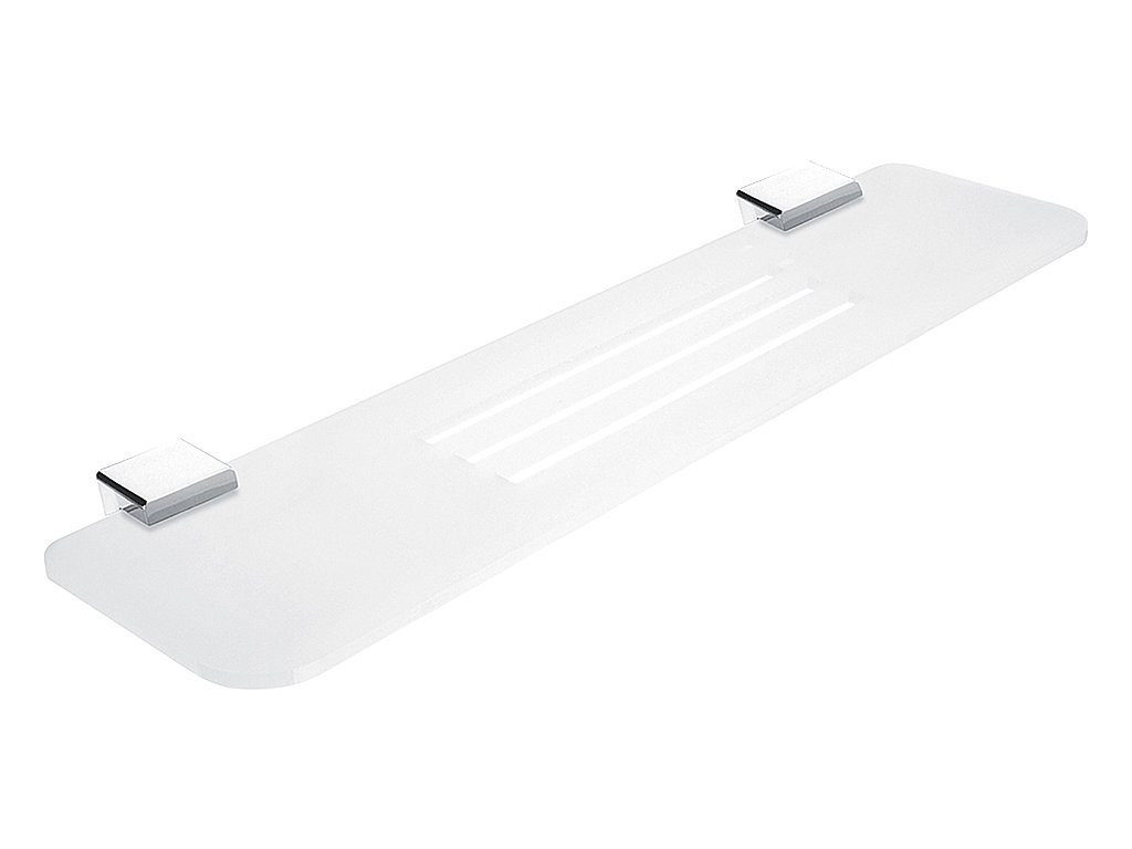 Police s frézovanými otvory. Materiál plexiglass s matným povrchem. Délka 50 cm. Úchyty mosaz / chrom.
