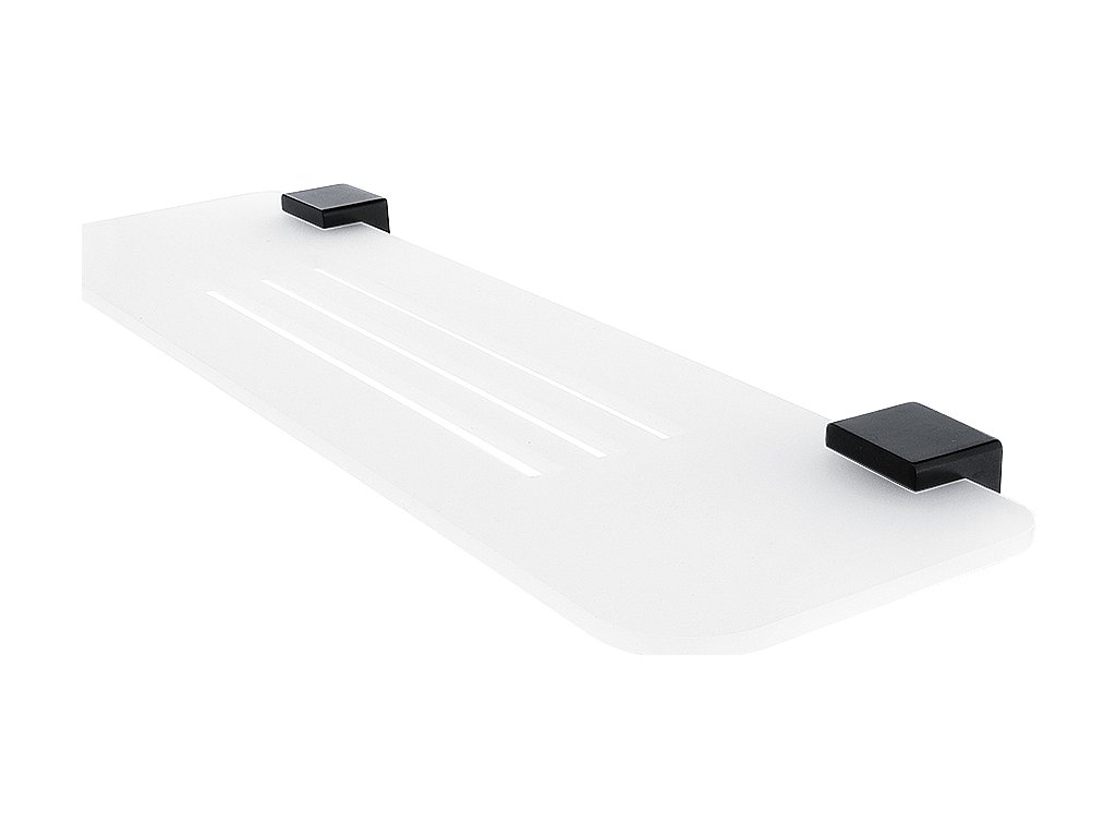 Police s frézovanými otvory. Materiál plexiglass s matným povrchem. Délka 60 cm. Úchyty mosaz / černý mat.