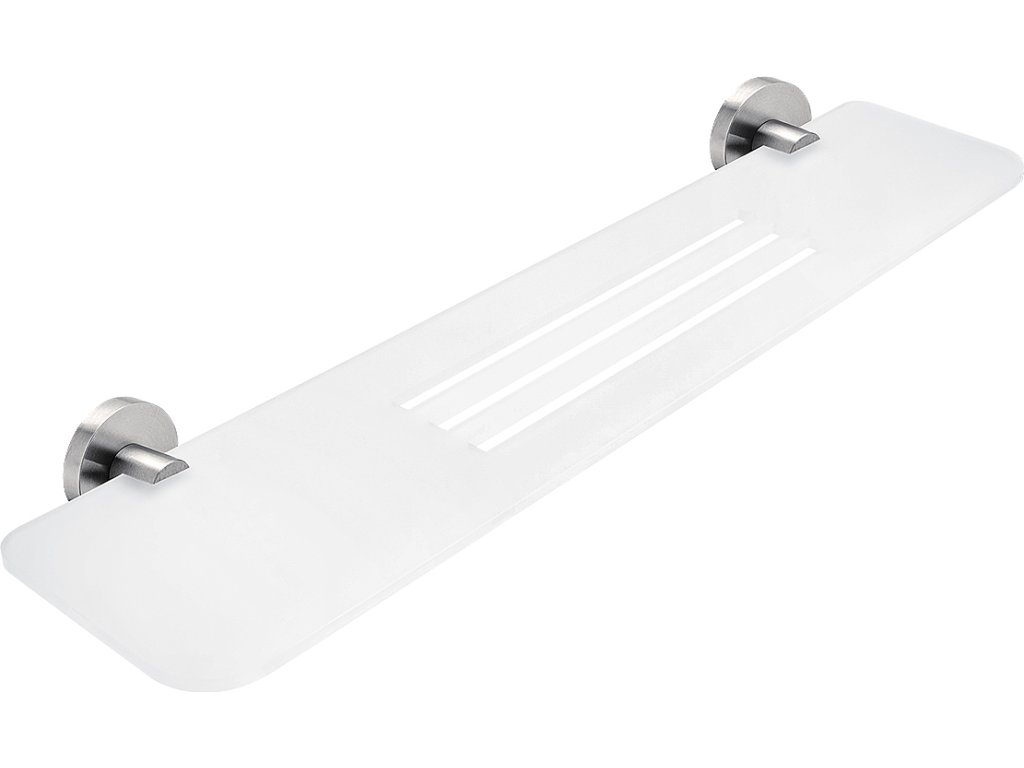 Police s frézovanými otvory. Materiál plexiglass s matným povrchem. Délka 60 cm. Úchyty broušená nerez.