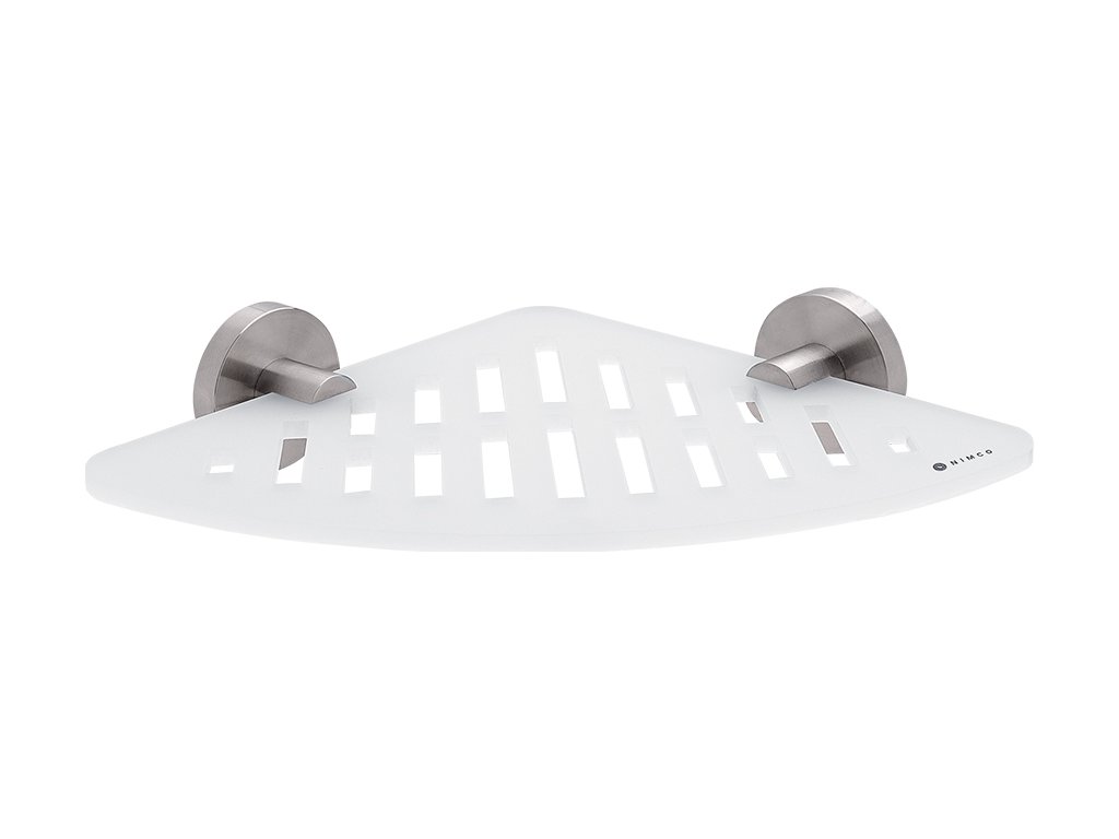 Rohová polička plexiglass s frézováním. Úchyty broušená nerez. Rozměr police 23,5x23,5 cm.