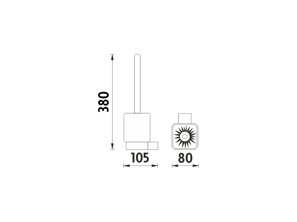 WC štětka s masivní hranatou rukojetí z mosazi, s keramickou nádobkou. Úchyt z mosazi, povrchová úprava chrom.