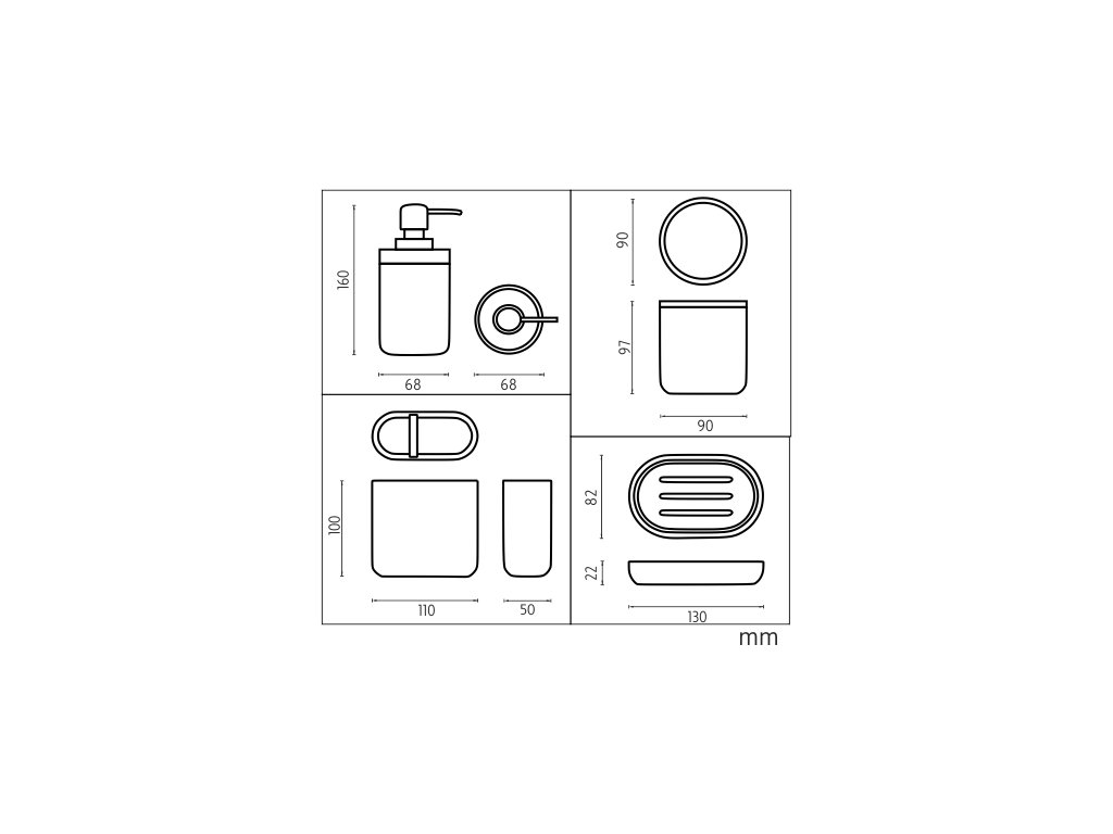 V sadě dávkovač, mýdlenka, dóza na kartáčky a dóza na tampóny. Barva pískově béžová.