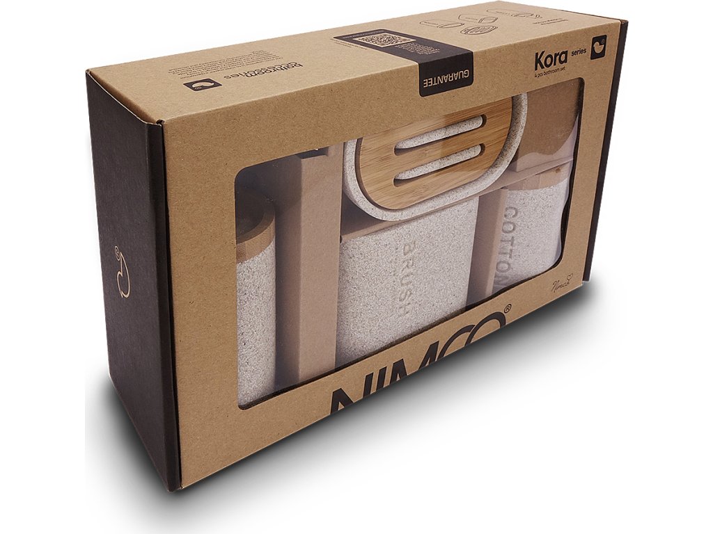 Sada doplňků do koupelny - dávkovač, mýdlenka, dóza, stojánek je skvělým doplňkem do koupelny. KORA v písčité béžové barvě vás zahřeje na první pohled. KORA je návrat k přírodě. Do popředí se derou přírodní materiály i odstíny. Dřevo, bambus, kameny a písek ve své naturální podobě vnášejí do prostoru koupelny uklidňující atmosféru a tolik potřebný pocit tepla a pohody. Dávkovač, mýdlenka, dózy na kart. a tampóny bude koupelně slušet mnohem více, pokud zvolíte i další doplňky série Kora z nabídky koupelnových a WC doplňků NIMCO.
