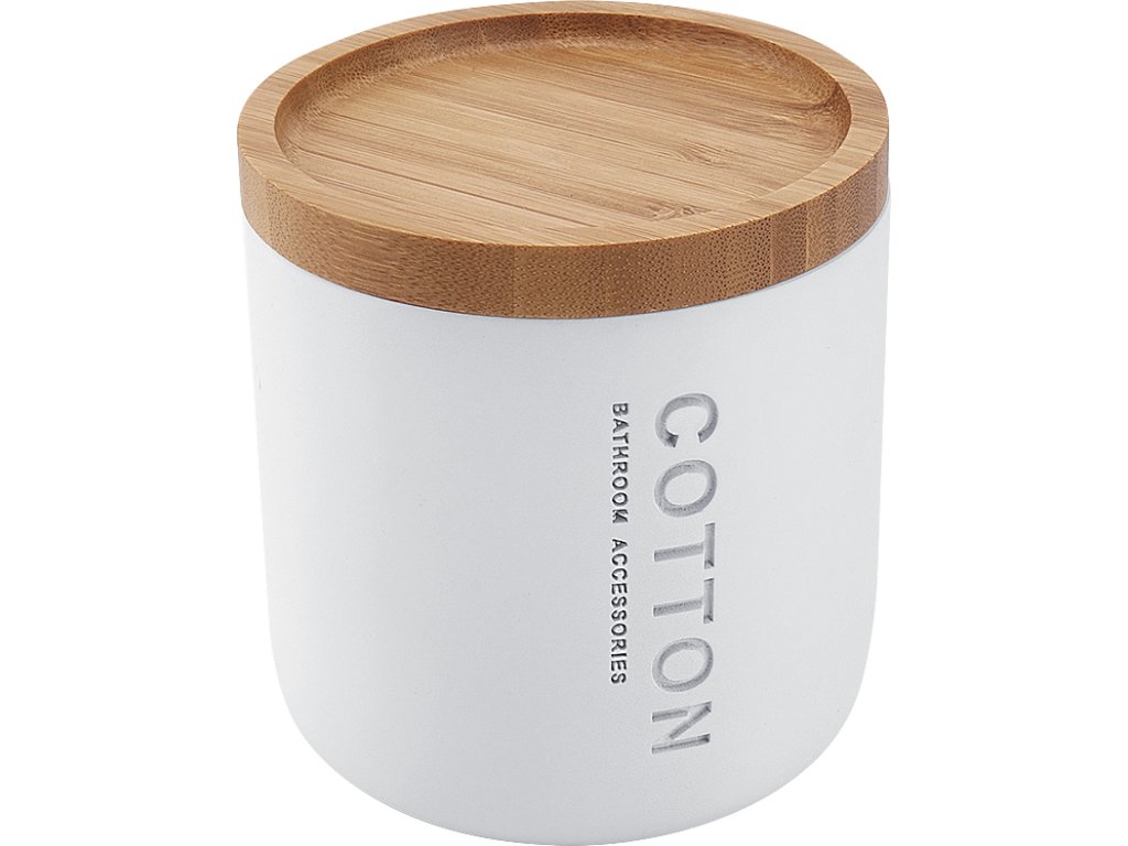 Dóza na kosmet. tampóny nebo jiné potřeby. Barva bílá. Materiál polyresin, bambusové dřevo.