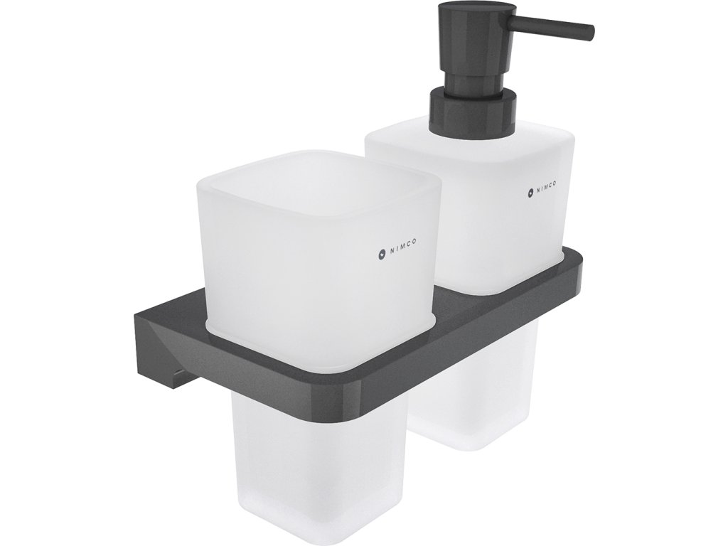 Dvojitý nástěnný držák na dávkovač mýdla a pohárek na zubní kartáčky z matného skla. Nádobky z matného skla v kombinaci s černým držákem perfektně ladí prostoru u umyvadla. Díky montáži na zeď je údržba umyvadla mnohem jednodušší. Dávkovač mýdla s mosaznou pumpičkou, povrchová úprava černá matná. Pro vyladěnou koupelnu doporučujeme i další produkty této designové řady. Dávkovač s pohárkem na kartáčky bude koupelně slušet mnohem více, pokud zvolíte i další doplňky série Maya černá z nabídky koupelnových a WC doplňků NIMCO.