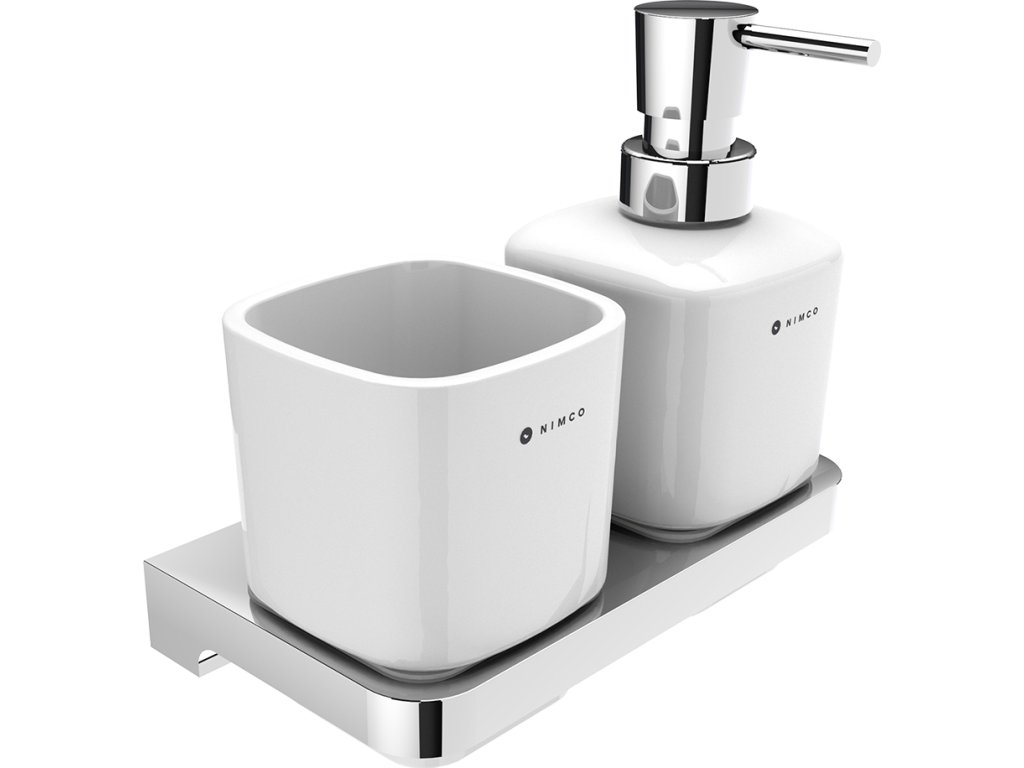 Dvojitý nástěnný držák na keramický dávkovač mýdla a pohárek na zubní kartáčky. Bílé keramické nádobky v kombinaci s chromovaným držákem perfektně ladí prostoru u umyvadla. Díky montáži na zeď je údržba umyvadla mnohem jednodušší. Dávkovač mýdla s plastovou pumpičkou, povrchová úprava chrom. Pro vyladěnou koupelnu doporučujeme i další produkty této designové řady. Dávkovač s pohárkem na kartáčky bude koupelně slušet mnohem více, pokud zvolíte i další doplňky série Maya z nabídky koupelnových a WC doplňků NIMCO.
