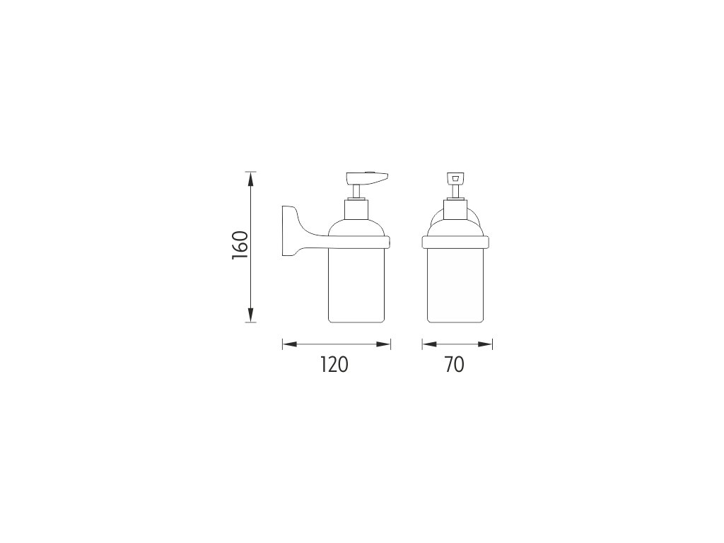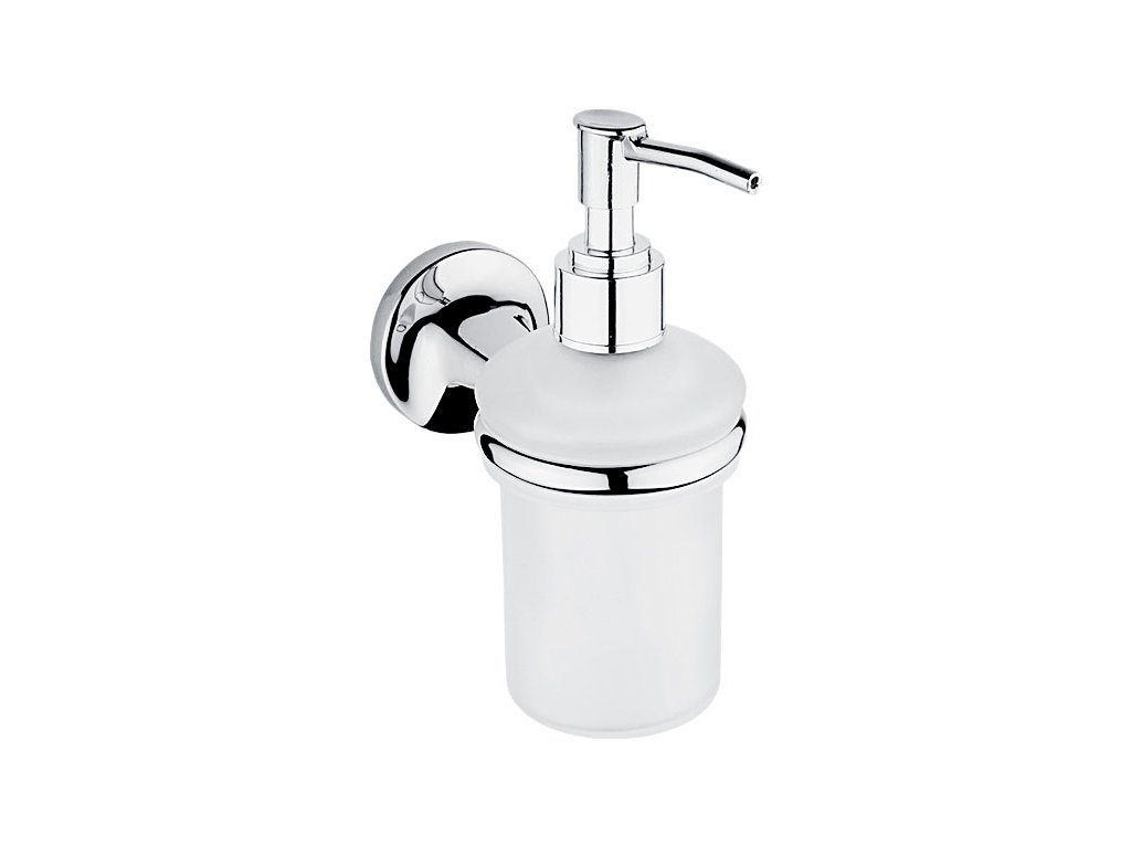 Nástěnný dávkovač tekutého mýdla. Pumpička plastová s povrchovou úpravou chrom. Nádobka z matného skla.