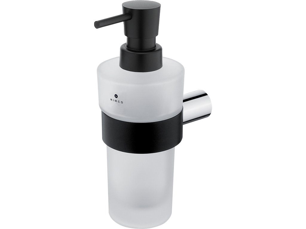 Nástěnný dávkovač tekutého mýdla z matného skla. Pumpička mosaz / černý mat. Objem nádobky 250 ml.