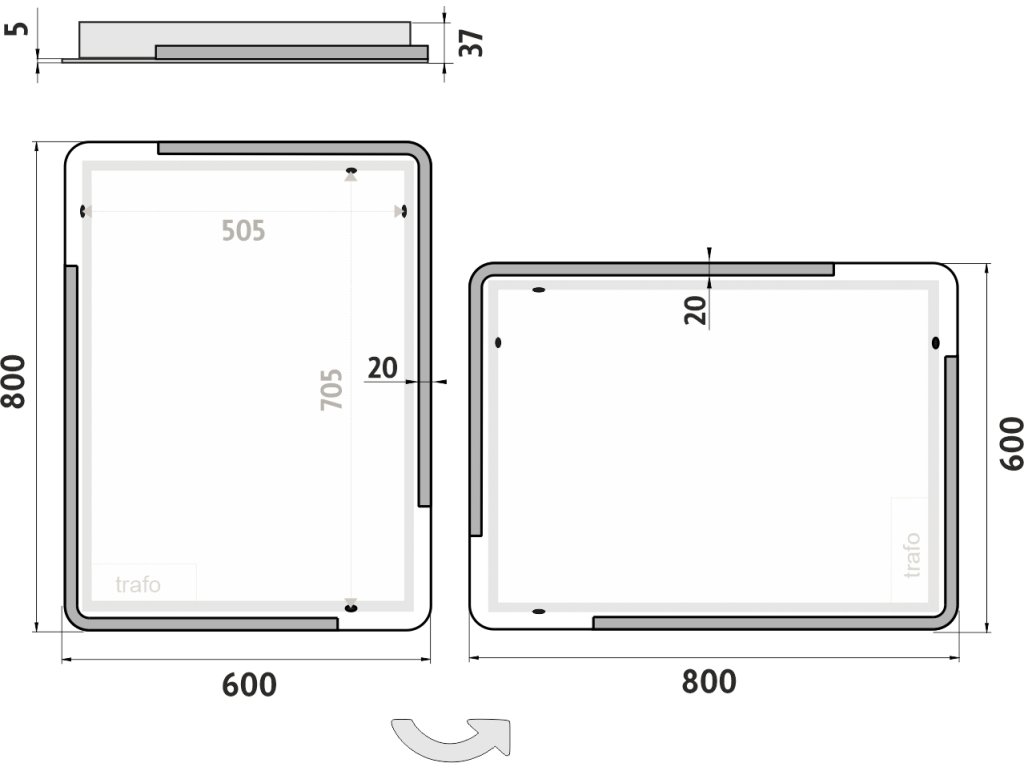 Obdélníkové bezrámové zrcadlo s oblými rohy a celoobvodovým podsvícením pro dokonalé a rovnoměrné osvětlení. Zrcadlo bez integrovaného vypínače je určené k připojení a ovládání nástěnným vypínačem. Barva podsvícení zrcadla je pevně nastavena. Ke zlepšení kvality podsvícení je použit difuzor z akrylového skla, který zajišťuje rovnoměrný a měkký rozptyl světla. LED diody jsou elegantně integrovány přímo v difuzoru, což zvyšuje intenzitu světla a zaručuje jeho jednotné rozprostření po celé ploše podsvícení. Výsledkem je příjemné a rovnoměrné osvětlení bez viditelných bodových zdrojů. Zrcadlo využívá nejmodernější LED čipy SMD 2835, které jsou známé svou vysokou svítivostí, energetickou úsporností a dlouhou životností. Hustota čipů 96/m, životnost 50 000 hodin. Parametry LED: Survival Factor = 1, Lumen Maintenance Factor 0,99 a Flicker Metric 0,02, pak zajišťují stabilní, bezblikavé a dlouhodobě konzistentní osvětlení. Nosná konstrukce zrcadla je vyrobena z masivního hliníkového rámu o rozměrech 32x19 mm, který zajišťuje vysokou pevnost a stabilitu. Stejně tak je z hliníku vyroben kryt zdroje a všech elektronických součástek. Sklo o tloušťce 5 mm je opatřeno bezpečnostní fólií, která chrání před zraněním v případě rozbití. Zrcadlo navíc disponuje stupněm ochrany proti vlhkosti IP44, což zaručuje spolehlivost i v prostředí s vyšší vlhkostí. Zrcadlo splňuje všechny české normy a je opatřeno českým certifikátem CE, který zaručuje jeho kvalitu a bezpečnost. Nabízí flexibilní možnosti upevnění, a to jak vertikálně, tak horizontálně, a je dodáváno včetně kompletní montážní sady a kabelové spojky s ochranou IP44. Pro zajištění bezpečné přepravy je zrcadlo pečlivě zabaleno a připraveno k expedici prostřednictvím kurýrní služby. Ovládání: Bez integrovaného spínače Ovládání nástěnným vypínačem Nastavení barvy podsvícení: Barva podsvícení pevně nastavena Barva podsvícení: Barva podsvícení 6500 K (studená bílá) vytváří jasné a přirozené světlo, ideální pro každodenní použití Funkce stmívání: Není instalováno Paměť nastavení: Není instalováno Konstrukce podsvícení: K rovnoměrnému rozptylu světla zrcadlo disponuje difuzorem z akrylového skla Integrace LED: LED diody jsou integrovány přímo v difuzoru LED čip: Nejmodernější LED čipy SMD 2835 LED pásek - hustota čipů: 96/m Životnost LED čipů: Až 50 000 hodin Kvalita osvětlení LED: Survival Factor = 1; Lumen maintenance factor = 0,99; Flicker metric = 0,02 Materiál: Zrcadlové sklo, hliník Materiál konstrukce: Rám zrcadla a kryt zdroje jsou vyrobeny z hliníku Tloušťka skla: 5 mm Ochrana při rozbití: Bezpečnostní fólie Stupeň ochrany: IP 44 Certifikace: Český certifikát CE Umístění: Montáž na stěnu Možnost upevnění vertikálně i horizontálně Montážní příslušenství: Součástí balení je montážní sada a kabelová spojka s ochranou IP 44 Obal: Zabalené pro přepravu kurýrní službou Napětí: Vstupní napětí 220-240 V Výstupní napětí 12 V Příkon: 32 W, světelný tok: 2304 lm Rozměr: v: 800 mm š: 35 mm d: 600 mm Hmotnost: 8,86 kg
