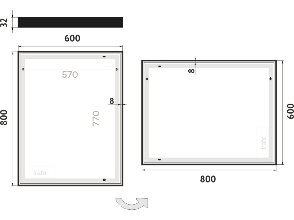 Obdélníkové zrcadlo s rámem s ostrými rohy a celoobvodovým svícením pro dokonalé a rovnoměrné osvětlení. Zrcadlo bez integrovaného vypínače je určené k připojení a ovládání nástěnným vypínačem. Barva světla zrcadla je pevně nastavena. Pro dosažení kvalitního a rovnoměrného svícení je použit akrylový difuzor, který zajišťuje měkký a harmonický rozptyl světla bez viditelných bodových zdrojů. LED diody jsou vkusně integrovány do rámu spolu s difuzorem, což přispívá k elegantnímu a čistému vzhledu zrcadla. Zrcadlo využívá nejmodernější LED čipy SMD 2835, které jsou známé svou vysokou svítivostí, energetickou úsporností a dlouhou životností. Hustota čipů 96/m, životnost 50 000 hodin. Parametry LED: Survival Factor = 1, Lumen Maintenance Factor 0,99 a Flicker Metric 0,02, pak zajišťují stabilní, bezblikavé a dlouhodobě konzistentní osvětlení. Nosná konstrukce zrcadla je vyrobena z masivního hliníkového rámu o rozměrech 32x19 mm, který zajišťuje vysokou pevnost a stabilitu. Stejně tak je z hliníku vyroben kryt zdroje a všech elektronických součástek. Sklo o tloušťce 5 mm je opatřeno bezpečnostní fólií, která chrání před zraněním v případě rozbití. Zrcadlo navíc disponuje stupněm ochrany proti vlhkosti IP44, což zaručuje spolehlivost i v prostředí s vyšší vlhkostí. Zrcadlo splňuje všechny české normy a je opatřeno českým certifikátem CE, který zaručuje jeho kvalitu a bezpečnost. Nabízí flexibilní možnosti upevnění, a to jak vertikálně, tak horizontálně, a je dodáváno včetně kompletní montážní sady a kabelové spojky s ochranou IP44. Pro zajištění bezpečné přepravy je zrcadlo pečlivě zabaleno a připraveno k expedici prostřednictvím kurýrní služby. Ovládání: Bez integrovaného spínače Ovládání nástěnným vypínačem Nastavení barvy světla: Barva světla pevně nastavena Barva světla: 4000 K (neutrální bílé světlo, ideální pro přesné a přirozené osvětlení) Funkce stmívání: Není instalováno Paměť nastavení: Není instalováno Konstrukce svícení: K rovnoměrnému rozptylu světla zrcadlo disponuje akrylovým matovaným difuzorem Integrace LED: Led diody jsou zabudované v rámu LED čip: Nejmodernější LED čipy SMD 2835 LED pásek - hustota čipů: 96/m Životnost LED čipů: Až 50 000 hodin Kvalita osvětlení LED: Survival Factor = 1; Lumen maintenance factor = 0,99; Flicker metric = 0,02 Materiál: Zrcadlové sklo, hliník Materiál konstrukce: Rám zrcadla a kryt zdroje jsou vyrobeny z hliníku Tloušťka skla: 5 mm Ochrana při rozbití: Bezpečnostní fólie Stupeň ochrany: IP 44 Certifikace: Český certifikát CE Umístění: Montáž na stěnu Možnost upevnění vertikálně i horizontálně Montážní příslušenství: Součástí balení je montážní sada a kabelová spojka s ochranou IP 44 Obal: Zabalené pro přepravu kurýrní službou Napětí: Vstupní napětí 220-240 V Výstupní napětí 12 V Příkon: 41 W, světelný tok: 2952 lm Rozměr: v: 800 mm š: 37 mm d: 600 mm Hmotnost: 8,04 kg