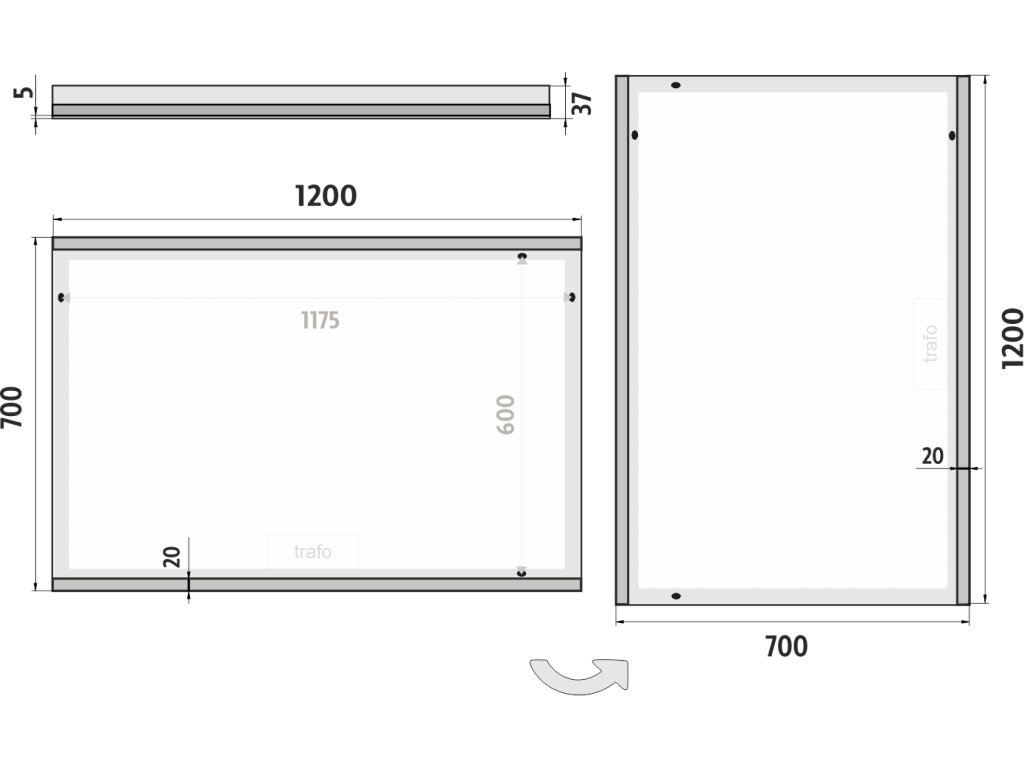 Obdélníkové bezrámové zrcadlo s ostrými rohy a podsvícením ze spodu a shora pro rovnoměrné a stylové osvětlení. Zrcadlo bez integrovaného vypínače je určené k připojení a ovládání nástěnným vypínačem. Barva podsvícení zrcadla je pevně nastavena. Ke zlepšení kvality podsvícení je použit difuzor z akrylového skla, který zajišťuje rovnoměrný a měkký rozptyl světla. LED diody jsou elegantně integrovány přímo v difuzoru, což zvyšuje intenzitu světla a zaručuje jeho jednotné rozprostření po celé ploše podsvícení. Výsledkem je příjemné a rovnoměrné osvětlení bez viditelných bodových zdrojů. Zrcadlo využívá nejmodernější LED čipy SMD 2835, které jsou známé svou vysokou svítivostí, energetickou úsporností a dlouhou životností. Hustota čipů 96/m, životnost 50 000 hodin. Parametry LED: Survival Factor = 1, Lumen Maintenance Factor 0,99 a Flicker Metric 0,02, pak zajišťují stabilní, bezblikavé a dlouhodobě konzistentní osvětlení. Nosná konstrukce zrcadla je vyrobena z masivního hliníkového rámu o rozměrech 32x19 mm, který zajišťuje vysokou pevnost a stabilitu. Stejně tak je z hliníku vyroben kryt zdroje a všech elektronických součástek. Sklo o tloušťce 5 mm je opatřeno bezpečnostní fólií, která chrání před zraněním v případě rozbití. Zrcadlo navíc disponuje stupněm ochrany proti vlhkosti IP44, což zaručuje spolehlivost i v prostředí s vyšší vlhkostí. Zrcadlo splňuje všechny české normy a je opatřeno českým certifikátem CE, který zaručuje jeho kvalitu a bezpečnost. Nabízí flexibilní možnosti upevnění, a to jak vertikálně, tak horizontálně, a je dodáváno včetně kompletní montážní sady a kabelové spojky s ochranou IP44. Pro zajištění bezpečné přepravy je zrcadlo pečlivě zabaleno a připraveno k expedici prostřednictvím kurýrní služby. Ovládání: Bez integrovaného spínače Ovládání nástěnným vypínačem Nastavení barvy podsvícení: Barva podsvícení pevně nastavena Barva podsvícení: Barva podsvícení 6500 K (studená bílá) vytváří jasné a přirozené světlo, ideální pro každodenní použití Funkce stmívání: Není instalováno Paměť nastavení: Není instalováno Konstrukce podsvícení: K rovnoměrnému rozptylu světla zrcadlo disponuje difuzorem z akrylového skla Integrace LED: LED diody jsou integrovány přímo v difuzoru LED čip: Nejmodernější LED čipy SMD 2835 LED pásek - hustota čipů: 96/m Životnost LED čipů: Až 50 000 hodin Kvalita osvětlení LED: Survival Factor = 1; Lumen maintenance factor = 0,99; Flicker metric = 0,02 Materiál: Zrcadlové sklo, hliník Materiál konstrukce: Rám zrcadla a kryt zdroje jsou vyrobeny z hliníku Tloušťka skla: 5 mm Ochrana při rozbití: Bezpečnostní fólie Stupeň ochrany: IP 44 Certifikace: Český certifikát CE Umístění: Montáž na stěnu Možnost upevnění vertikálně i horizontálně Montážní příslušenství: Součástí balení je montážní sada a kabelová spojka s ochranou IP 44 Obal: Zabalené pro přepravu kurýrní službou Napětí: Vstupní napětí 220-240 V Výstupní napětí 12 V Příkon: 35 W, světelný tok: 2520 lm Rozměr: v: 700 mm š: 35 mm d: 1200 mm Hmotnost: 14,56 kg