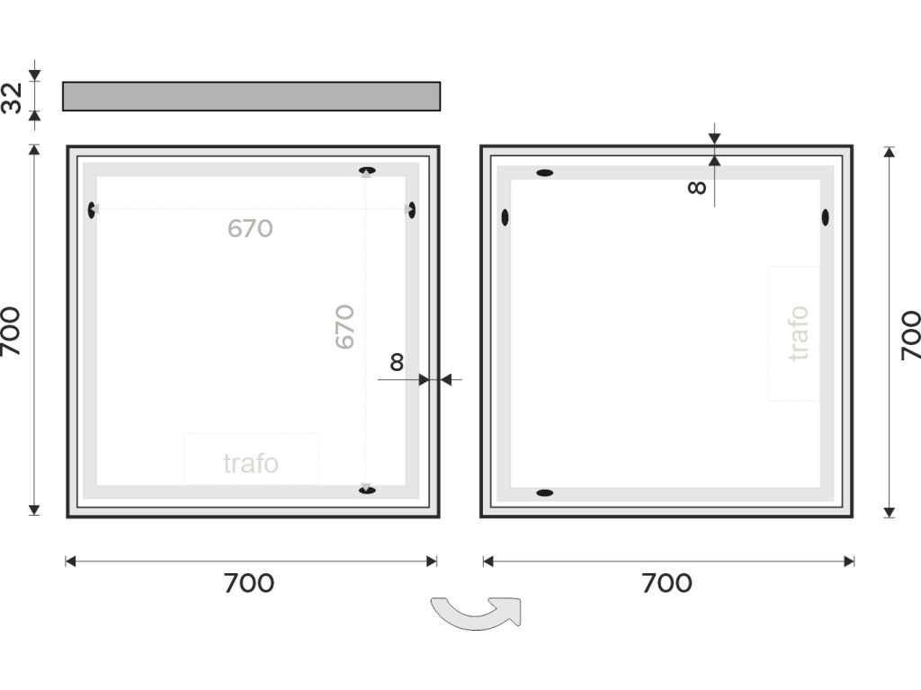 Čtvercové zrcadlo s rámem s ostrými rohy a celoobvodovým svícením pro dokonalé a rovnoměrné osvětlení. Zrcadlo bez integrovaného vypínače je určené k připojení a ovládání nástěnným vypínačem. Barva světla zrcadla je pevně nastavena. Pro dosažení kvalitního a rovnoměrného svícení je použit akrylový difuzor, který zajišťuje měkký a harmonický rozptyl světla bez viditelných bodových zdrojů. LED diody jsou vkusně integrovány do rámu spolu s difuzorem, což přispívá k elegantnímu a čistému vzhledu zrcadla. Zrcadlo využívá nejmodernější LED čipy SMD 2835, které jsou známé svou vysokou svítivostí, energetickou úsporností a dlouhou životností. Hustota čipů 96/m, životnost 50 000 hodin. Parametry LED: Survival Factor = 1, Lumen Maintenance Factor 0,99 a Flicker Metric 0,02, pak zajišťují stabilní, bezblikavé a dlouhodobě konzistentní osvětlení. Nosná konstrukce zrcadla je vyrobena z masivního hliníkového rámu o rozměrech 32x19 mm, který zajišťuje vysokou pevnost a stabilitu. Stejně tak je z hliníku vyroben kryt zdroje a všech elektronických součástek. Sklo o tloušťce 5 mm je opatřeno bezpečnostní fólií, která chrání před zraněním v případě rozbití. Zrcadlo navíc disponuje stupněm ochrany proti vlhkosti IP44, což zaručuje spolehlivost i v prostředí s vyšší vlhkostí. Zrcadlo splňuje všechny české normy a je opatřeno českým certifikátem CE, který zaručuje jeho kvalitu a bezpečnost. Nabízí flexibilní možnosti upevnění, a to jak vertikálně, tak horizontálně, a je dodáváno včetně kompletní montážní sady a kabelové spojky s ochranou IP44. Pro zajištění bezpečné přepravy je zrcadlo pečlivě zabaleno a připraveno k expedici prostřednictvím kurýrní služby. Ovládání: Bez integrovaného spínače Ovládání nástěnným vypínačem Nastavení barvy světla: Barva světla pevně nastavena Barva světla: 4000 K (neutrální bílé světlo, ideální pro přesné a přirozené osvětlení) Funkce stmívání: Není instalováno Paměť nastavení: Není instalováno Konstrukce svícení: K rovnoměrnému rozptylu světla zrcadlo disponuje akrylovým matovaným difuzorem Integrace LED: Led diody jsou zabudované v rámu LED čip: Nejmodernější LED čipy SMD 2835 LED pásek - hustota čipů: 96/m Životnost LED čipů: Až 50 000 hodin Kvalita osvětlení LED: Survival Factor = 1; Lumen maintenance factor = 0,99; Flicker metric = 0,02 Materiál: Zrcadlové sklo, hliník Materiál konstrukce: Rám zrcadla a kryt zdroje jsou vyrobeny z hliníku Tloušťka skla: 5 mm Ochrana při rozbití: Bezpečnostní fólie Stupeň ochrany: IP 44 Certifikace: Český certifikát CE Umístění: Montáž na stěnu Možnost upevnění vertikálně i horizontálně Montážní příslušenství: Součástí balení je montážní sada a kabelová spojka s ochranou IP 44 Obal: Zabalené pro přepravu kurýrní službou Napětí: Vstupní napětí 220-240 V Výstupní napětí 12 V Příkon: 32 W, světelný tok: 2304 lm Rozměr: v: 700 mm š: 32 mm d: 700 mm Hmotnost: 8,22 kg