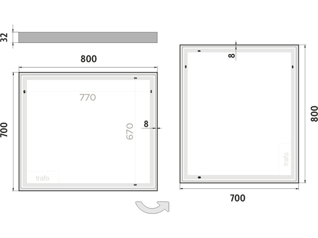 Obdélníkové zrcadlo s rámem s ostrými rohy a celoobvodovým svícením pro dokonalé a rovnoměrné osvětlení. Zrcadlo bez integrovaného vypínače je určené k připojení a ovládání nástěnným vypínačem. Barva světla zrcadla je pevně nastavena. Pro dosažení kvalitního a rovnoměrného svícení je použit akrylový difuzor, který zajišťuje měkký a harmonický rozptyl světla bez viditelných bodových zdrojů. LED diody jsou vkusně integrovány do rámu spolu s difuzorem, což přispívá k elegantnímu a čistému vzhledu zrcadla. Zrcadlo využívá nejmodernější LED čipy SMD 2835, které jsou známé svou vysokou svítivostí, energetickou úsporností a dlouhou životností. Hustota čipů 96/m, životnost 50 000 hodin. Parametry LED: Survival Factor = 1, Lumen Maintenance Factor 0,99 a Flicker Metric 0,02, pak zajišťují stabilní, bezblikavé a dlouhodobě konzistentní osvětlení. Nosná konstrukce zrcadla je vyrobena z masivního hliníkového rámu o rozměrech 32x19 mm, který zajišťuje vysokou pevnost a stabilitu. Stejně tak je z hliníku vyroben kryt zdroje a všech elektronických součástek. Sklo o tloušťce 5 mm je opatřeno bezpečnostní fólií, která chrání před zraněním v případě rozbití. Zrcadlo navíc disponuje stupněm ochrany proti vlhkosti IP44, což zaručuje spolehlivost i v prostředí s vyšší vlhkostí. Zrcadlo splňuje všechny české normy a je opatřeno českým certifikátem CE, který zaručuje jeho kvalitu a bezpečnost. Nabízí flexibilní možnosti upevnění, a to jak vertikálně, tak horizontálně, a je dodáváno včetně kompletní montážní sady a kabelové spojky s ochranou IP44. Pro zajištění bezpečné přepravy je zrcadlo pečlivě zabaleno a připraveno k expedici prostřednictvím kurýrní služby. Ovládání: Bez integrovaného spínače Ovládání nástěnným vypínačem Nastavení barvy světla: Barva světla pevně nastavena Barva světla: 4000 K (neutrální bílé světlo, ideální pro přesné a přirozené osvětlení) Funkce stmívání: Není instalováno Paměť nastavení: Není instalováno Konstrukce svícení: K rovnoměrnému rozptylu světla zrcadlo disponuje akrylovým matovaným difuzorem Integrace LED: Led diody jsou zabudované v rámu LED čip: Nejmodernější LED čipy SMD 2835 LED pásek - hustota čipů: 96/m Životnost LED čipů: Až 50 000 hodin Kvalita osvětlení LED: Survival Factor = 1; Lumen maintenance factor = 0,99; Flicker metric = 0,02 Materiál: Zrcadlové sklo, hliník Materiál konstrukce: Rám zrcadla a kryt zdroje jsou vyrobeny z hliníku Tloušťka skla: 5 mm Ochrana při rozbití: Bezpečnostní fólie Stupeň ochrany: IP 44 Certifikace: Český certifikát CE Umístění: Montáž na stěnu Možnost upevnění vertikálně i horizontálně Montážní příslušenství: Součástí balení je montážní sada a kabelová spojka s ochranou IP 44 Obal: Zabalené pro přepravu kurýrní službou Napětí: Vstupní napětí 220-240 V Výstupní napětí 12 V Příkon: 44 W, světelný tok: 3168 lm Rozměr: v: 700 mm š: 35 mm d: 800 mm Hmotnost: 9,5 kg