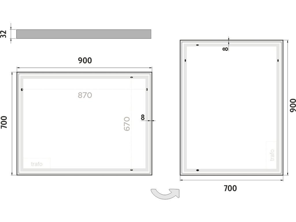 Obdélníkové zrcadlo s rámem s ostrými rohy a celoobvodovým svícením pro dokonalé a rovnoměrné osvětlení. Zrcadlo bez integrovaného vypínače je určené k připojení a ovládání nástěnným vypínačem. Barva světla zrcadla je pevně nastavena. Pro dosažení kvalitního a rovnoměrného svícení je použit akrylový difuzor, který zajišťuje měkký a harmonický rozptyl světla bez viditelných bodových zdrojů. LED diody jsou vkusně integrovány do rámu spolu s difuzorem, což přispívá k elegantnímu a čistému vzhledu zrcadla. Zrcadlo využívá nejmodernější LED čipy SMD 2835, které jsou známé svou vysokou svítivostí, energetickou úsporností a dlouhou životností. Hustota čipů 96/m, životnost 50 000 hodin. Parametry LED: Survival Factor = 1, Lumen Maintenance Factor 0,99 a Flicker Metric 0,02, pak zajišťují stabilní, bezblikavé a dlouhodobě konzistentní osvětlení. Nosná konstrukce zrcadla je vyrobena z masivního hliníkového rámu o rozměrech 32x19 mm, který zajišťuje vysokou pevnost a stabilitu. Stejně tak je z hliníku vyroben kryt zdroje a všech elektronických součástek. Sklo o tloušťce 5 mm je opatřeno bezpečnostní fólií, která chrání před zraněním v případě rozbití. Zrcadlo navíc disponuje stupněm ochrany proti vlhkosti IP44, což zaručuje spolehlivost i v prostředí s vyšší vlhkostí. Zrcadlo splňuje všechny české normy a je opatřeno českým certifikátem CE, který zaručuje jeho kvalitu a bezpečnost. Nabízí flexibilní možnosti upevnění, a to jak vertikálně, tak horizontálně, a je dodáváno včetně kompletní montážní sady a kabelové spojky s ochranou IP44. Pro zajištění bezpečné přepravy je zrcadlo pečlivě zabaleno a připraveno k expedici prostřednictvím kurýrní služby. Ovládání: Bez integrovaného spínače Ovládání nástěnným vypínačem Nastavení barvy světla: Barva světla pevně nastavena Barva světla: 4000 K (neutrální bílé světlo, ideální pro přesné a přirozené osvětlení) Funkce stmívání: Není instalováno Paměť nastavení: Není instalováno Konstrukce svícení: K rovnoměrnému rozptylu světla zrcadlo disponuje akrylovým matovaným difuzorem Integrace LED: Led diody jsou zabudované v rámu LED čip: Nejmodernější LED čipy SMD 2835 LED pásek - hustota čipů: 96/m Životnost LED čipů: Až 50 000 hodin Kvalita osvětlení LED: Survival Factor = 1; Lumen maintenance factor = 0,99; Flicker metric = 0,02 Materiál: Zrcadlové sklo, hliník Materiál konstrukce: Rám zrcadla a kryt zdroje jsou vyrobeny z hliníku Tloušťka skla: 5 mm Ochrana při rozbití: Bezpečnostní fólie Stupeň ochrany: IP 44 Certifikace: Český certifikát CE Umístění: Montáž na stěnu Možnost upevnění vertikálně i horizontálně Montážní příslušenství: Součástí balení je montážní sada a kabelová spojka s ochranou IP 44 Obal: Zabalené pro přepravu kurýrní službou Napětí: Vstupní napětí 220-240 V Výstupní napětí 12 V Příkon: 47 W, světelný tok: 3384 lm Rozměr: v: 700 mm š: 35 mm d: 900 mm Hmotnost: 10,4 kg