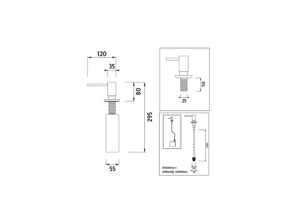 Vestavěný dávkovač saponátu, mýdla nebo dezinfekčního gelu do dřezu či umyvadla. Hlava pumpy průměr 35 mm. Plnění 350 ml nádobky shora vyjmutím pumpy.