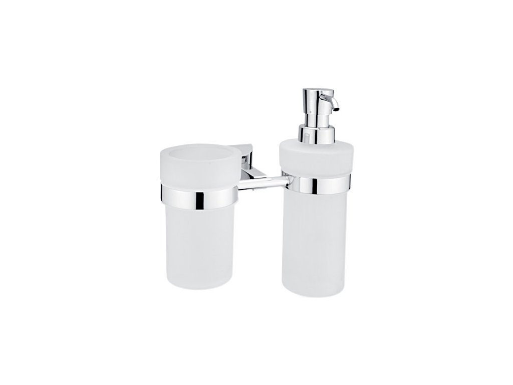 Dvojitý držák sklenky a dávkovače, 250 ml. Nádobky matné sklo. Pumpička plastová s povrch.úpravou chrom.