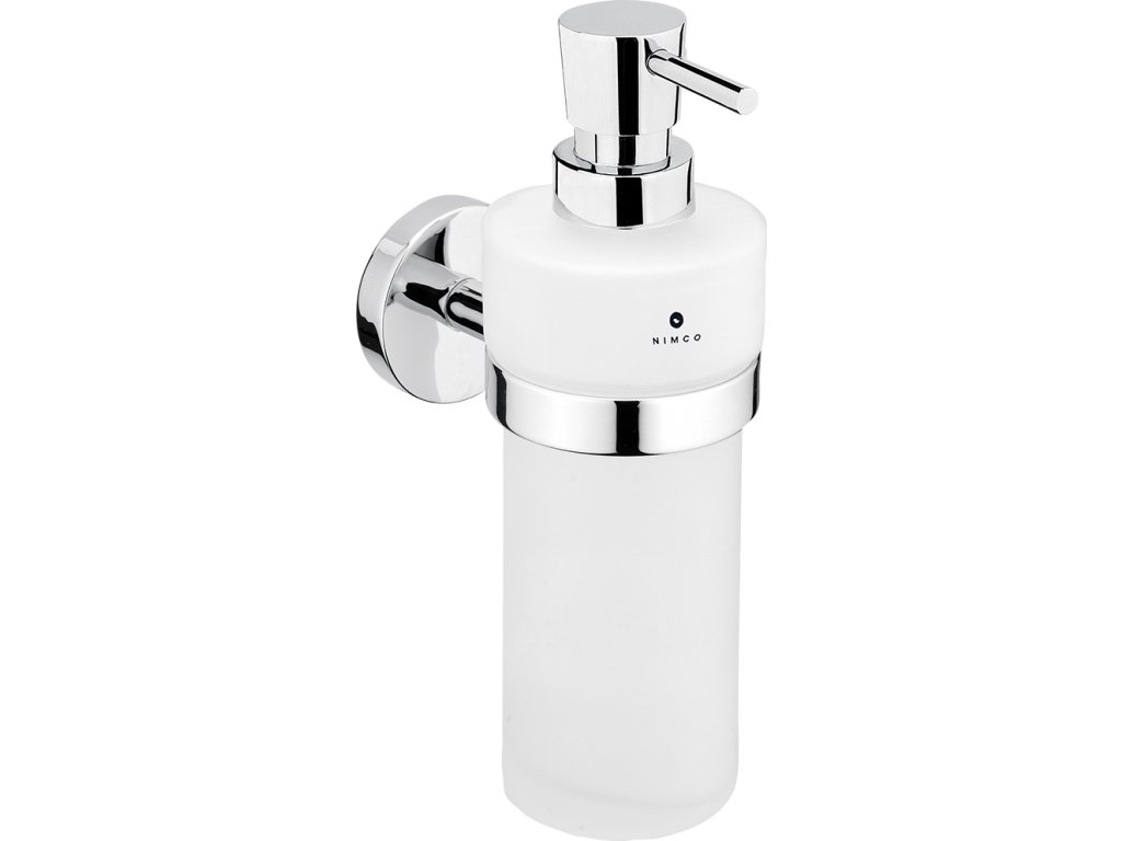 Nástěnný dávkovač na tekuté mýdlo. Nádobka z matného sklo. Pumpička mosaz/chrom. Objem 250 ml.