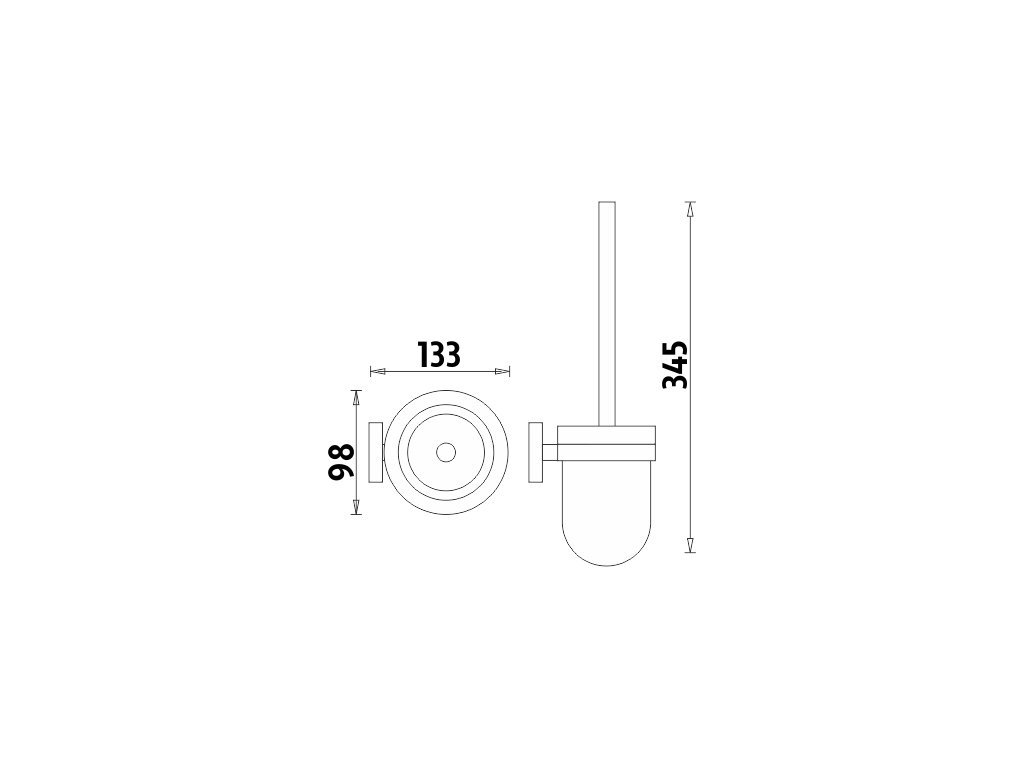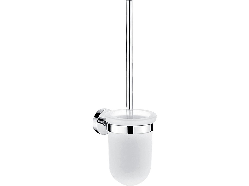 WC štětka. Nádobka nízká z matného skla. Rukojeť kartáče z mosazi s povrch. úpravou chrom.