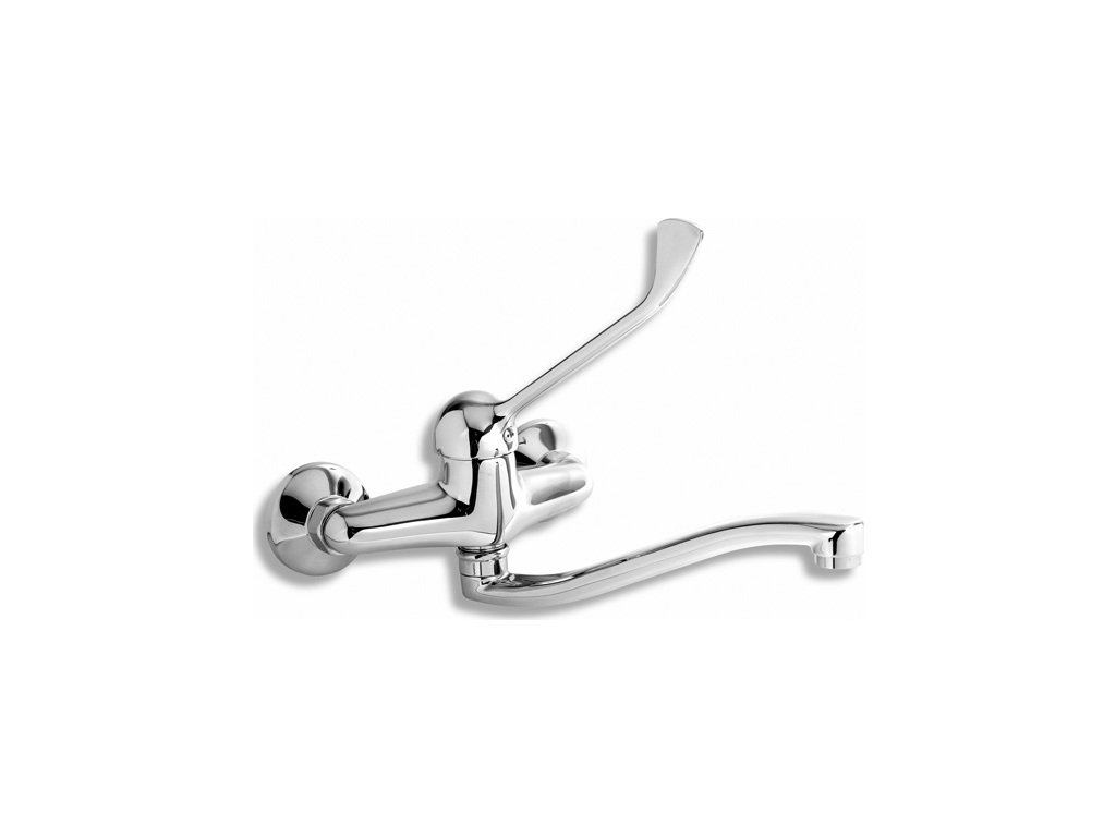 Dřezová nebo umyvadlová nástěnná baterie s lékařskou pákou. Délka ramínka 250 mm. Rozteč 150 mm.