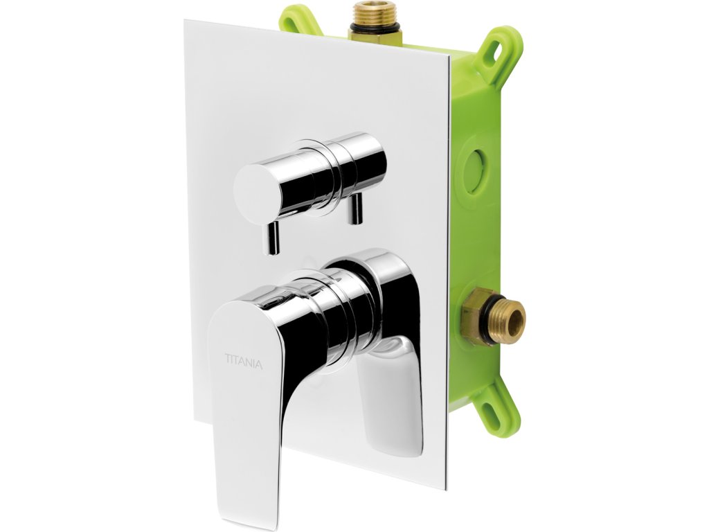 Kvalitní a odolná keramická kartuše 35 mm s prodlouženou zárukou 5 let. Prvotřídní chromové provedení. Podomítková baterie s boxem pro 2 vývody vody a s keramickým přepínačem. Box je dodávaný komplet včetně krytu a ovládací páky. Součástí je vodováha pro snadnou a přesnou montáž.