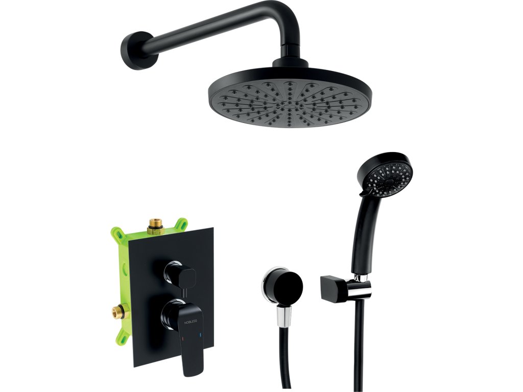 Sprchová podomítková sada s příslušenstvím v provedení černá-mat. Box je dodávaný komplet včetně krytu a ovládací páky. Sada obsahuje podomítkovou sprchovou baterii s kvalitní keramickou kartuší s prodlouženou zárukou 5 let a keramickým přepínačem, plastovou hadici 150 cm, ramínko ze zdi v délce 350 mm, hlavovou sprchu o průměru 200 mm, 3-polohovou ruční sprchu, stěnový vývod vody a držák na ruční sprchu.