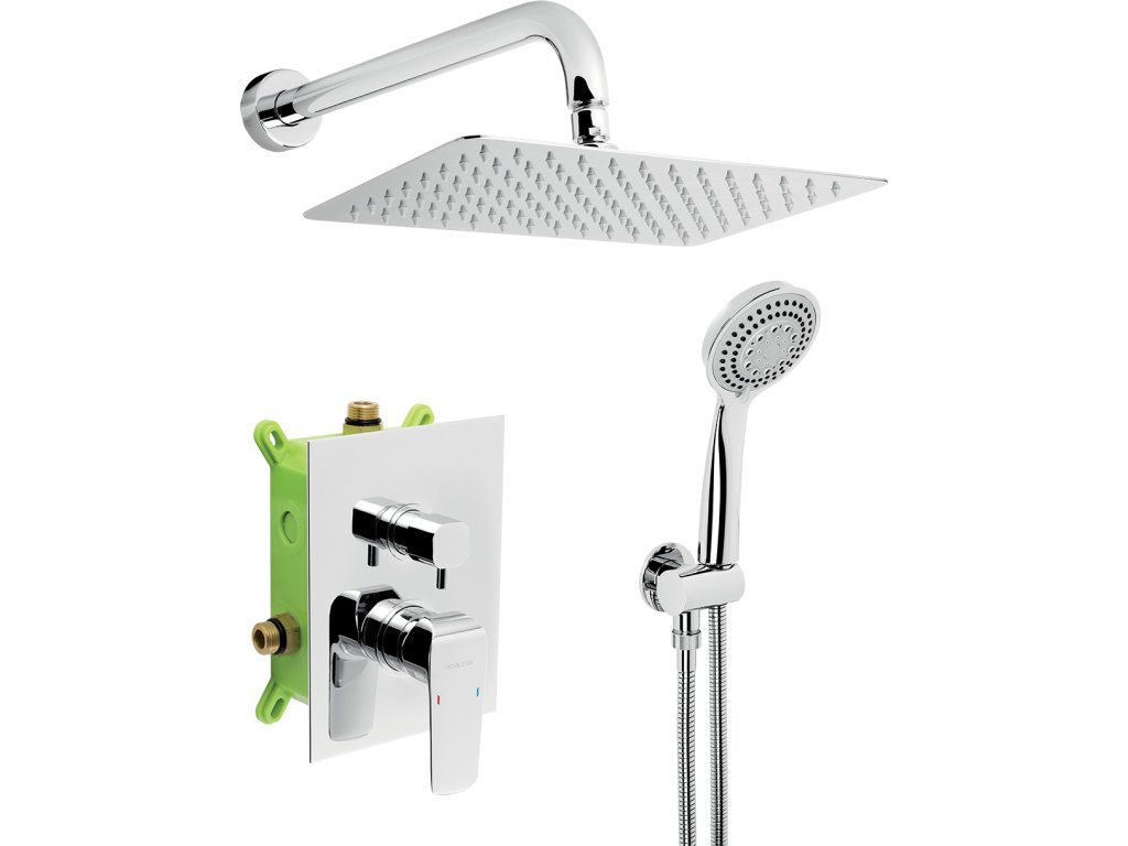 Sprchová podomítková sada s příslušenstvím v provedení chrom. Box je dodávaný komplet včetně krytu a ovládací páky. Sada obsahuje podomítkovou sprchovou baterii BOX38051R,0 s kvalitní keramickou kartuší s prodlouženou zárukou 5 let a keramickým přepínačem, kovovou hadici H/7000,0 150 cm, ramínko ze zdi RAM350,0 v délce 350 mm, hlavovou sprchu ve SLIM designu RUP/203,4 v rozměru 300 x 200 mm, 3-polohovou ruční sprchu RU/893,0 a stěnový vývod vody s držákem na ruční sprchu D/LUXUS,0 .