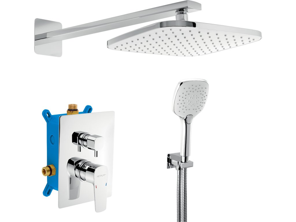Sprchová podomítková sada s příslušenstvím v provedení chrom. Box je dodávaný komplet včetně krytu a ovládací páky. Sada obsahuje podomítkovou sprchovou baterii s keramickou kartušou KEROX s prodlouženou zárukou 7 let, hadici 150 cm, hlavovou sprchu v rozměru 230x230 mm s ramenem délky 400 mm, úspornou 3-polohovou ruční sprchu a hranatý stěnový vývod vody s držákem na ruční sprchu.