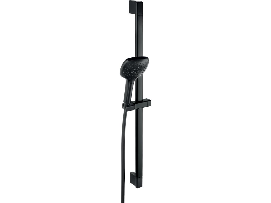 Sprchová souprava černá-mat pro sprchové baterie obsahuje 3-polohovou ruční sprchu s průtokem max vody 6 l/min, posuvný držák sprchy v délce 780 mm a kovovou sprchovou hadici s anti-twist v délce 150 cm.