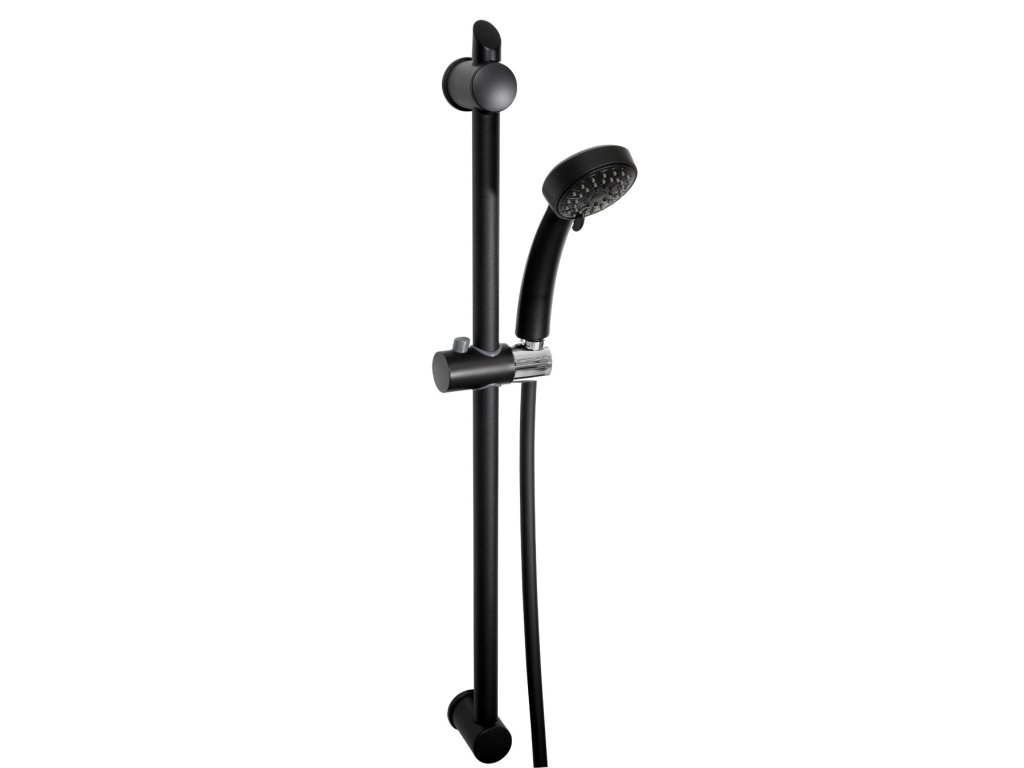 Sprchová souprava v provedení černá-mat pro sprchové baterie obsahuje 3-polohovou ruční sprchu, posuvný držák sprchy v délce 740 mm a plastovou sprchovou hadici s anti-twist v délce 150 cm. Průměr tyče 25 mm.