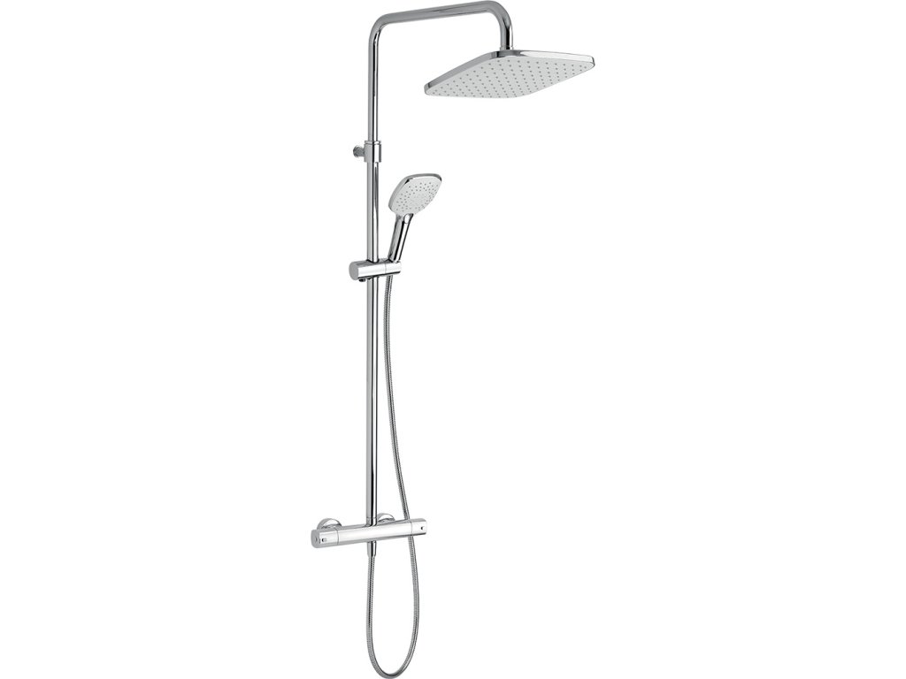 Set obsahuje nástěnnou termostatickou baterii s horním vývodem a roztečí 150 mm s kvalitní a odolnou keramickou kartuší KEROX 35 mm s prodlouženou zárukou 7 let. Prvotřídní chromové provedení. Součástí balení je kovová sprchová hadice 150 cm, hlavová sprcha 230 x 230 mm, 3-polohová ruční sprcha a posuvný jezdec s držákem ruční sprchy. Set je výškově nastavitelný 1035 - 1225 mm. Umožňuje nastavit i odchýlení vrchního úchytu od stěny v rozmezí 50 - 80 mm. Hlavová sprcha obsahuje šetřící regulátor průtoku vody na max 12 l/min a je vybavena EASY CLEAN tryskami pro snadné čištění.