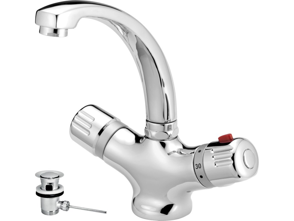 Odolná termostatická kartuše s prodlouženou zárukou 7 let. Prvotřídní chromové provedení. Stojánková umyvadlová termostatická baterie s 5/4" výpustí s otočným ramenem délky 130 mm. Součástí baterie jsou přívodní hadičky.